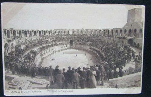 1913 France sepia photo postcard bullfight original Roman amphitheater Arles F