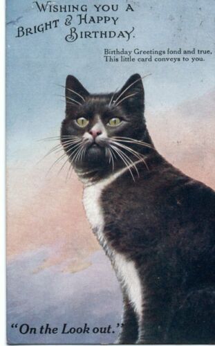 VINTAGE ART BIRTHDAY GREETING postcard: LOVELY BLACK & WHITE CAT