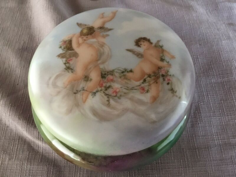 Large French Hand Painted Angels Cherub Porcelain Powder Dish