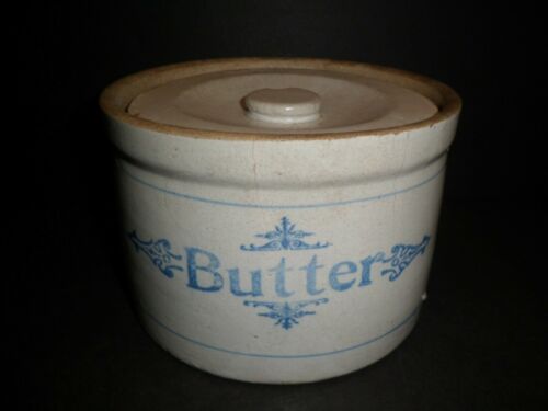 Antique Stoneware Butter Crock with Lid, Blue Markings, NICE