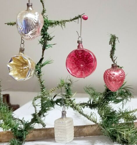 Title (ebay affiliate link): Five Early 1900s Glass German Ornaments. Two Indents, Heart, Cube, Rose.