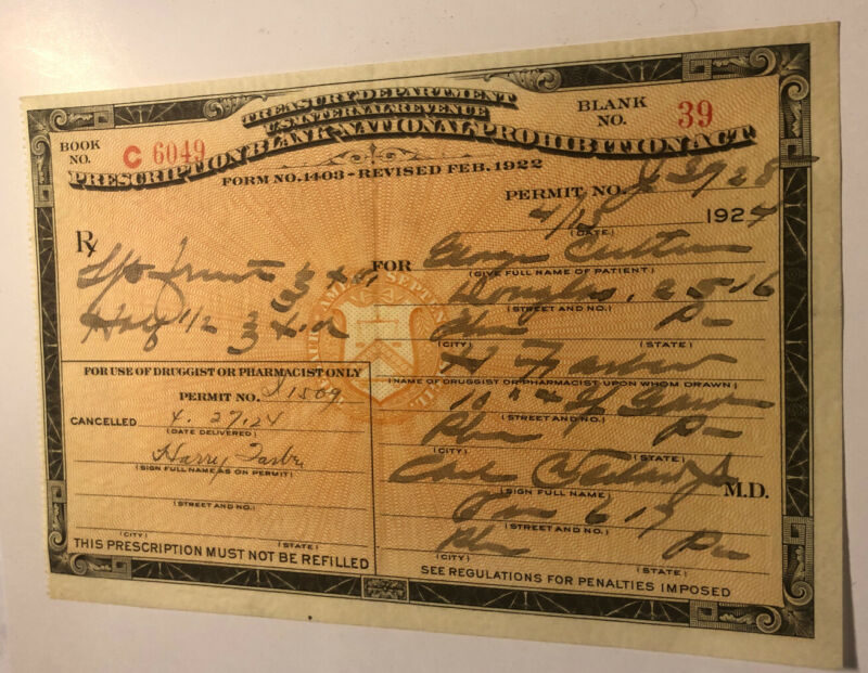 Title (ebay affiliate link): Prescription black national prohibition act 1924 Philadelphia PA