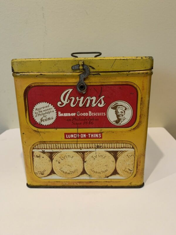 Title (ebay affiliate link): Vintage Ivins of Philadelphia Biscuit Cookie Tin Lunch-On-Thin Advertising Tin