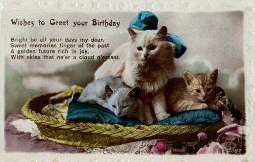 VINTAGE BIRTHDAY GREETING postcard: BEAUTIFUL CAT & KITTENS