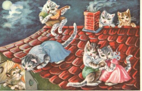 Title (ebay affiliate link): VINTAGE ART postcard: ANTHROPOMORPHIC KITTEN CATS ON ROOFTOP IN MOONLLIGHT EK