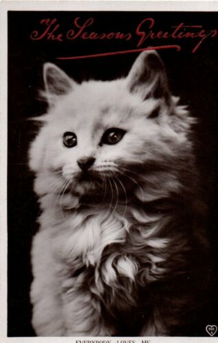 VINTAGE CHRISTMAS GREETING postcard: PRETTY WHITE KITTEN CAT everybody loves me
