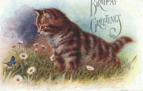 VINTAGE ART postcard: TABBY KITTEN CAT & BLUE BUTTERFLY by CT HOWARD