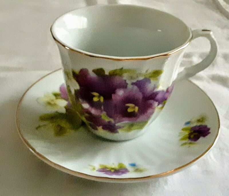 PURPLE PANSIES TEACUP & SAUCER W/ GOLD TRIM
