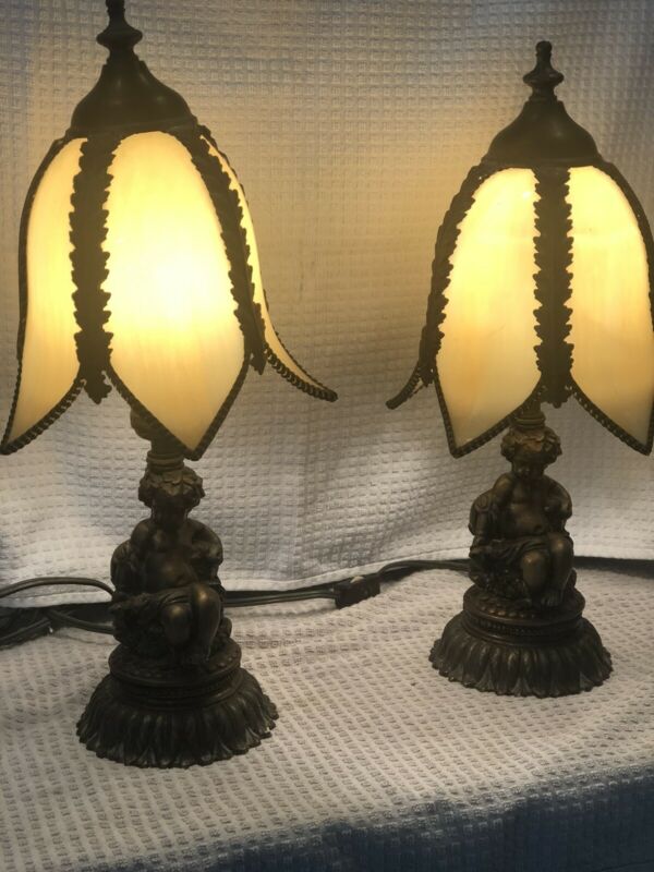 ~Set Vintage Metal Cherub Table Lamps W/shades. Working Condition