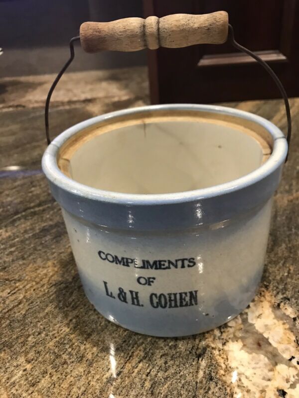 Vintage Blue & White Stoneware Butter Crock w/ Bale & Wooden Handle. L&H Cohen