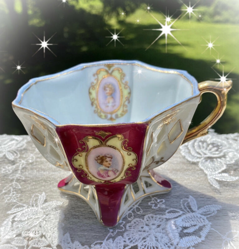 Antique CAMEO Portrait Footed TEACUP Maroon Lattice