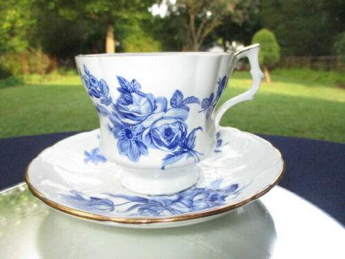 CUP SAUCER ROYAL WINDSOR ENGLAND BLUE COTTAGE CABBAGE ROSES ENAMEL DECORATED