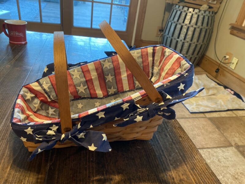Title (ebay affiliate link): LONGABERGER LARGE VEGETABLE BASKET W/ HANDLES 1988 With Red White Blue Liner