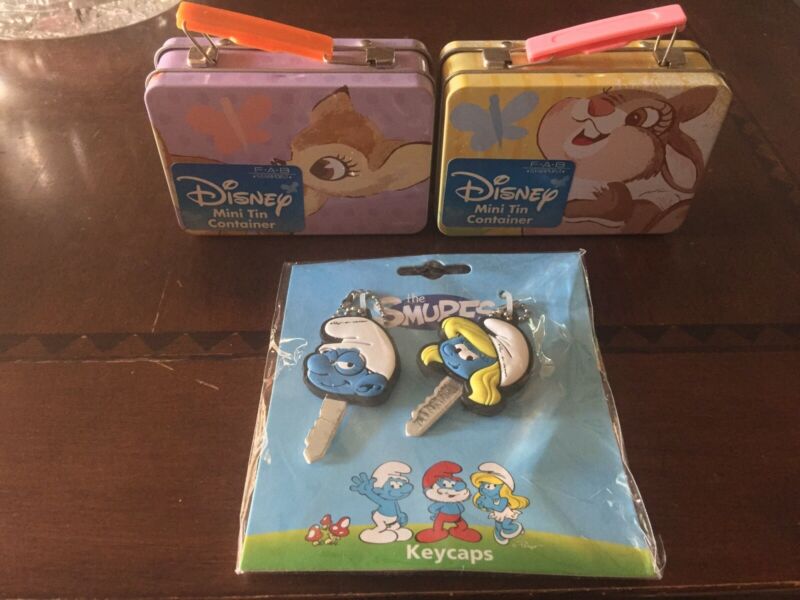 Title (ebay affiliate link): 2 Small Disney Tins, And Smurf Key Covers