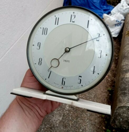 Title (ebay affiliate link): 1930s Art Deco Cream Bakelite & Brass Smith 8 Day Mantle Clock