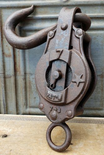 Title (ebay affiliate link): Antique Cast Iron Pulley Block & Tackle Boston Lockport Co Nautical Hook Tool