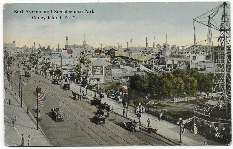 1915 Coney Island NY Surf Avenue & Steeplechase Park Postcard