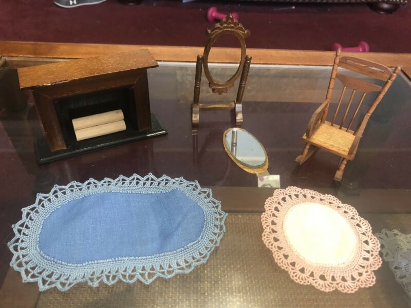 Title (ebay affiliate link): Vintage Dollhouse parts Fireplace Mirror Rocking Chair Rugs old furniture