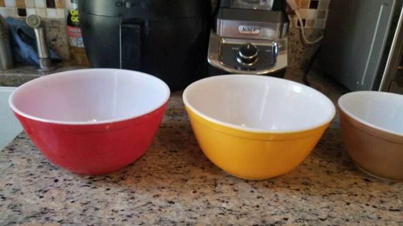 3 PYREX Red Yellow 402 Mixing Bowl Pair Brown 401 RARE