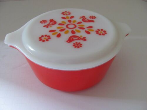 Title (ebay affiliate link): Pyrex Friendship Birds 472 1-1/2 Pint Casserole Dish w/milk glass decorated lid