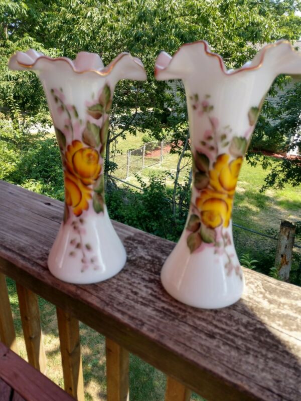 Title (ebay affiliate link): Pair of Consolidated Milk Glass/Rainbow Art Co. Rose Pattern Vases 10.25"