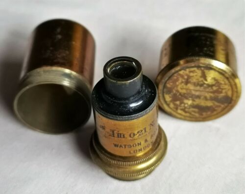 Title (ebay affiliate link): Antique Brass 1 Inch 0.21 NA Watsons & Sons London Microscope Lens In Case