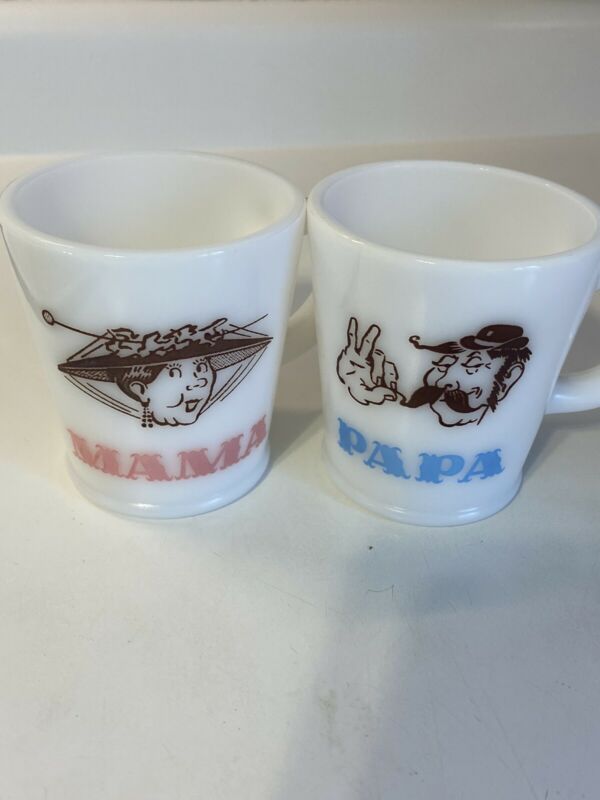 MAMA PAPA MUG SET 2 VINTAGE WHITE MILK GLASS HAZEL ATLAS PINK BLUE A-5 A-17 ECU