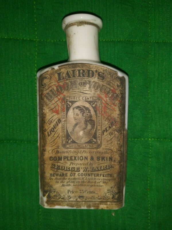 Title (ebay affiliate link): antique milk glass medicine bottle, Lairds Bloom of Youth/Liquid Pearl w label