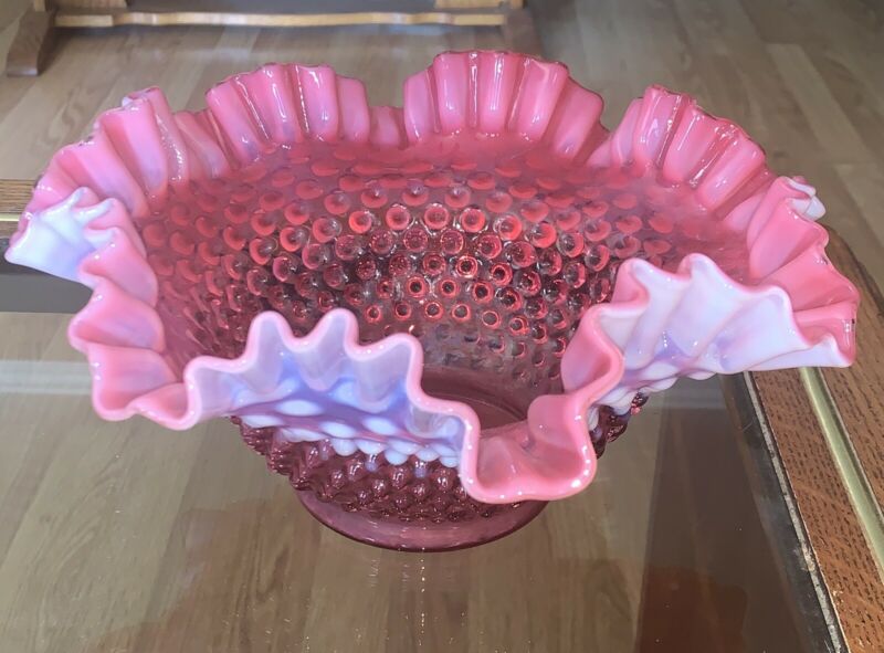 Title (ebay affiliate link): Fenton Vintage Red Hobnail Milk Glass Vintage 10" Bowl, Large Round Ruffle Top.