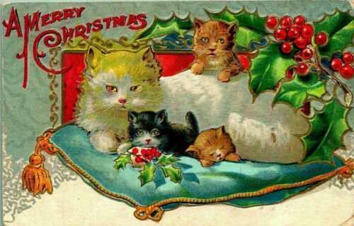 Title (ebay affiliate link): Cute~Christmas ~Mama Cat w Kittens on Blue Pillow~Antique Postcard-a705