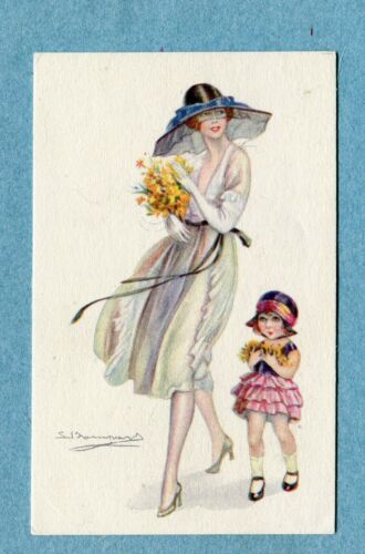Title (ebay affiliate link): A7951 Postcard Bompard Mother in White with Large Hat, Child in Pink and Blue