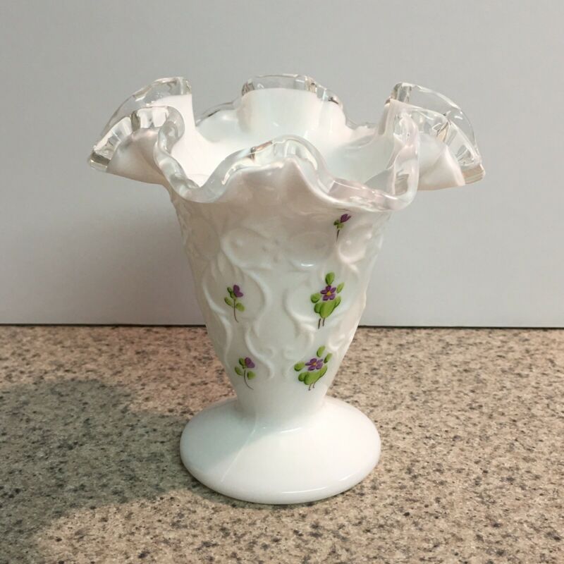 Title (ebay affiliate link): FENTON Milk Glass Silver Crest Ruffled Hand Painted "Spanish Lace" Trumpet Vase