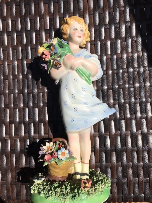 Fine Antique Italian 10" Porcelain Statue Happy Maiden With Basket of Flowers