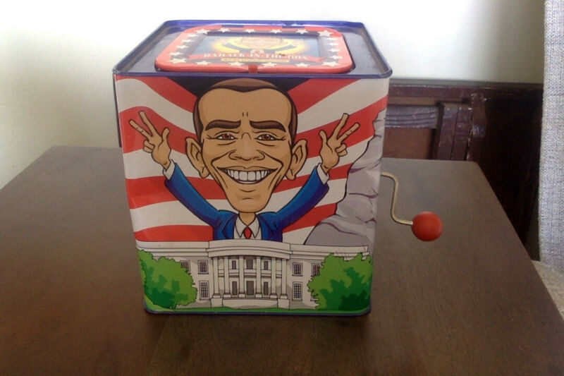 Barack-in-the-Box Obama jack-in-the box toy NIB WORKING