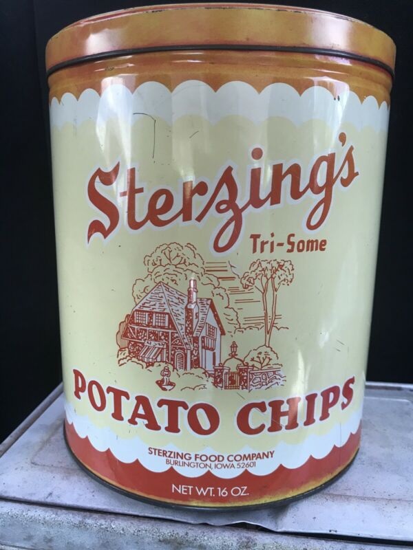 Vintage Sterzing''s Potato Chip Large Tin Can, Burlington, Iowa IA Antique