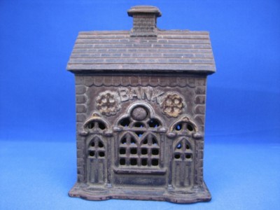 VINTAGE ANTIQUE CAST IRON BANK BUILDING COIN SAFE NR!