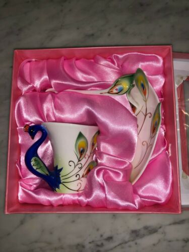 Hand crafted porcelain peacock tea cup, saucer, spoon set NIB