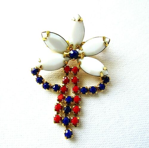Title (ebay affiliate link): Vintage Patriotic Brooch White Milk Glass Marquise~ Red Blue Rhinestones Dangle