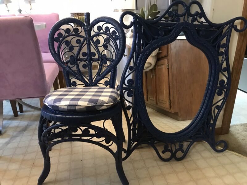 Title (ebay affiliate link): Vintage Wicker Peacock Heart Rattan Chair Boho W Blue Cushion