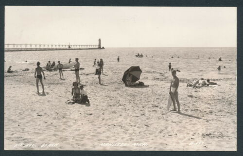 Title (ebay affiliate link): RPPC MANISTEE MICHIGAN 5th Avenue Beach Bathers Lighthouse Pier