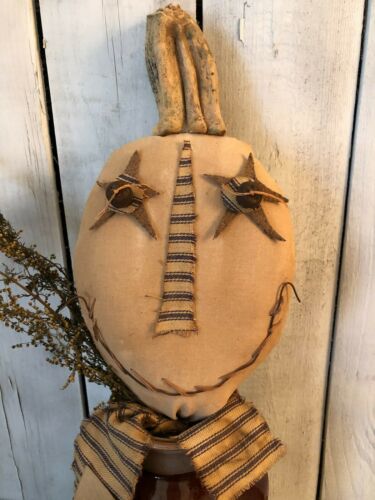 Primitive Pumpkin Doll Folk Art Doll Halloween Poke Crock Shelf Real Stem White