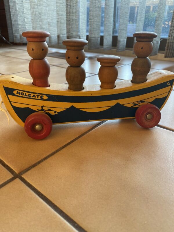 Title (ebay affiliate link): Vintage Holgate Yellow Blue Wooden Boat 4 Peg Sailors Wood Pull Toy 10"