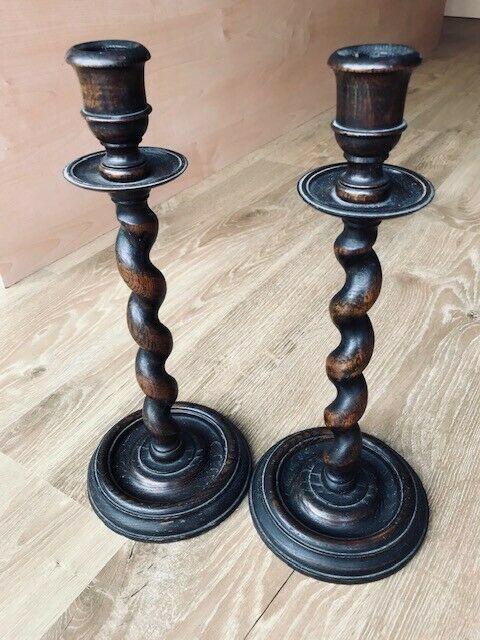 Candle stick holders, pair, dark wood, twisted stem, ornate, very old 36cm high.