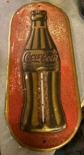 Title (ebay affiliate link): 1938 Gold Coca Cola Tin Metal Bottle Thermometer Coke Sign Antique Still Works!