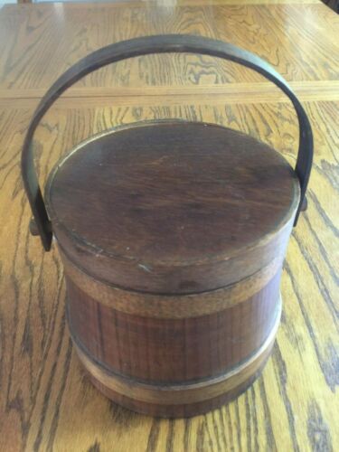 Title (ebay affiliate link): Small 6.5" Vintage Primitive Wooden Firkin Sugar Bucket w/ Handle & Lid