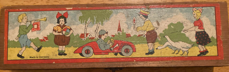 Title (ebay affiliate link): Vintage Wooden Pencil Box with Children And Car. Paper Label Germany