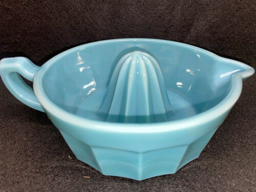 Title (ebay affiliate link): Blue Milk Glass lemon Juicer hand reamer fruit orange dish citrus pour spout art