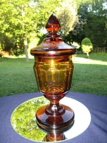 Title (ebay affiliate link): BOHEMIAN DARK AMBER DEPRESSION GLASS APOTHECARY JAR CANDY JAR GRAPE VINE CUT LID