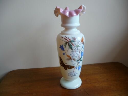 Title (ebay affiliate link): Antique Victorian Milk Glass Vase Hand Painted Flowers & Butterfly Frilled Rim
