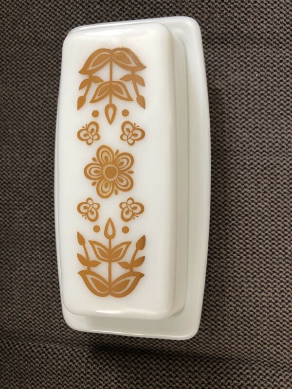 Vintage Pyrex Covered Butter Dish Harvest Gold Butterfly Flowers Milk Glass